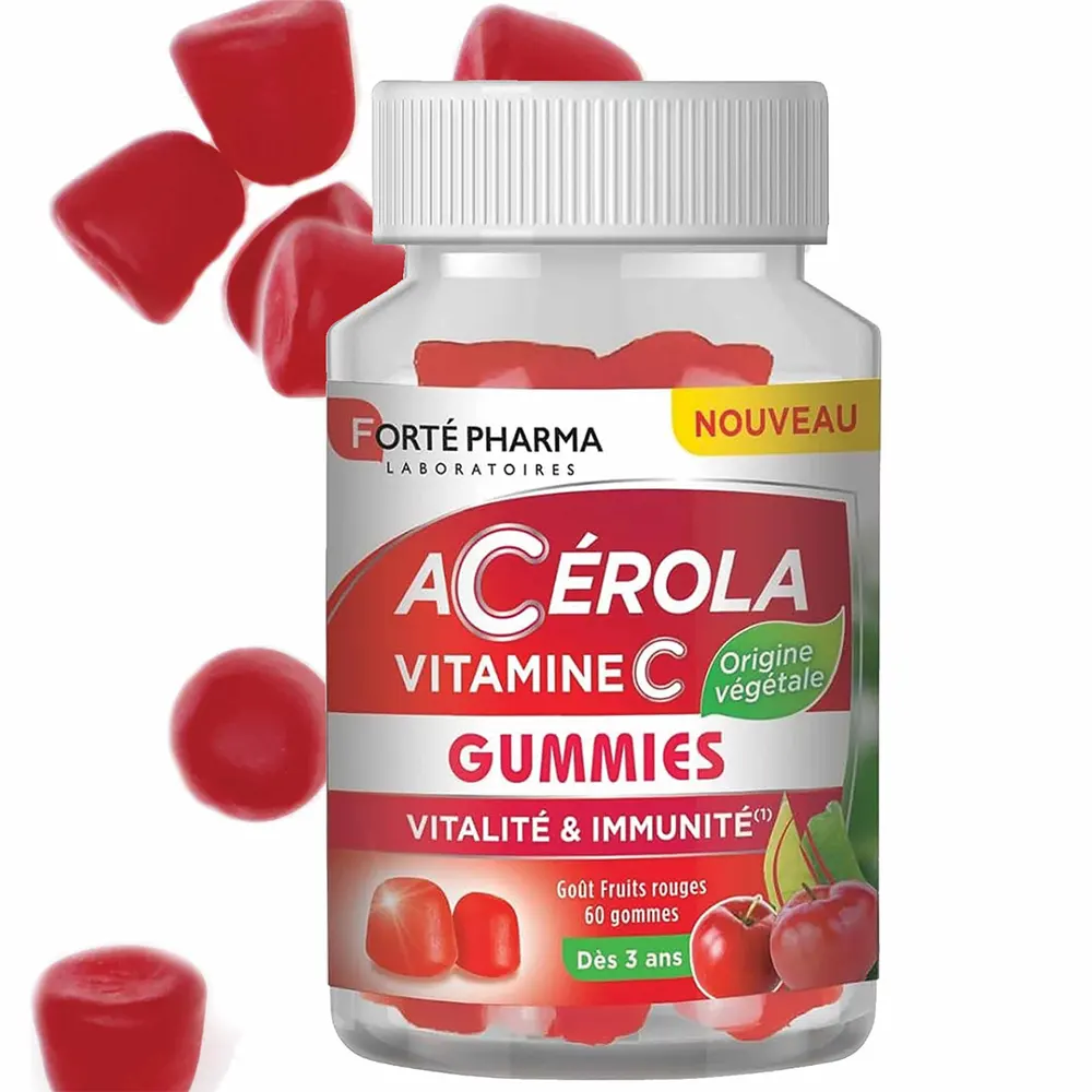 Acérola Vitamine C Gummies ce complément alimentaire est présenté sous forme de gummies(gommes à mâcher) au gout fruit rouges. Il est destiné à soutenir la vitalité et renforcer l’immunité ,grâce à sa teneur en vitamine C issue de l’acérola, une source naturelle et végétale.