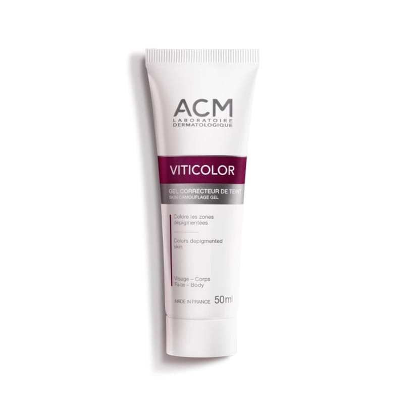 ACM Viticolor Gel Correcteur de Teint 50 ml est un gel correcteur teint durable qui peut s’utiliser conjointement aux traitements habituels du vitiligo en particulier la photothérapie, pour colorer les zones dépigmentées du visage et du corps.