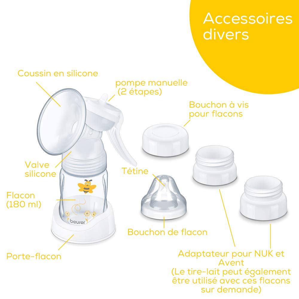 - Avec un biberon et un bouchon à vis adapté pour biberons, un embout de tire-lait manuel, un support de biberon, une tétine en silicone de forme naturelle pour une tétée plus aisée et un capuchon