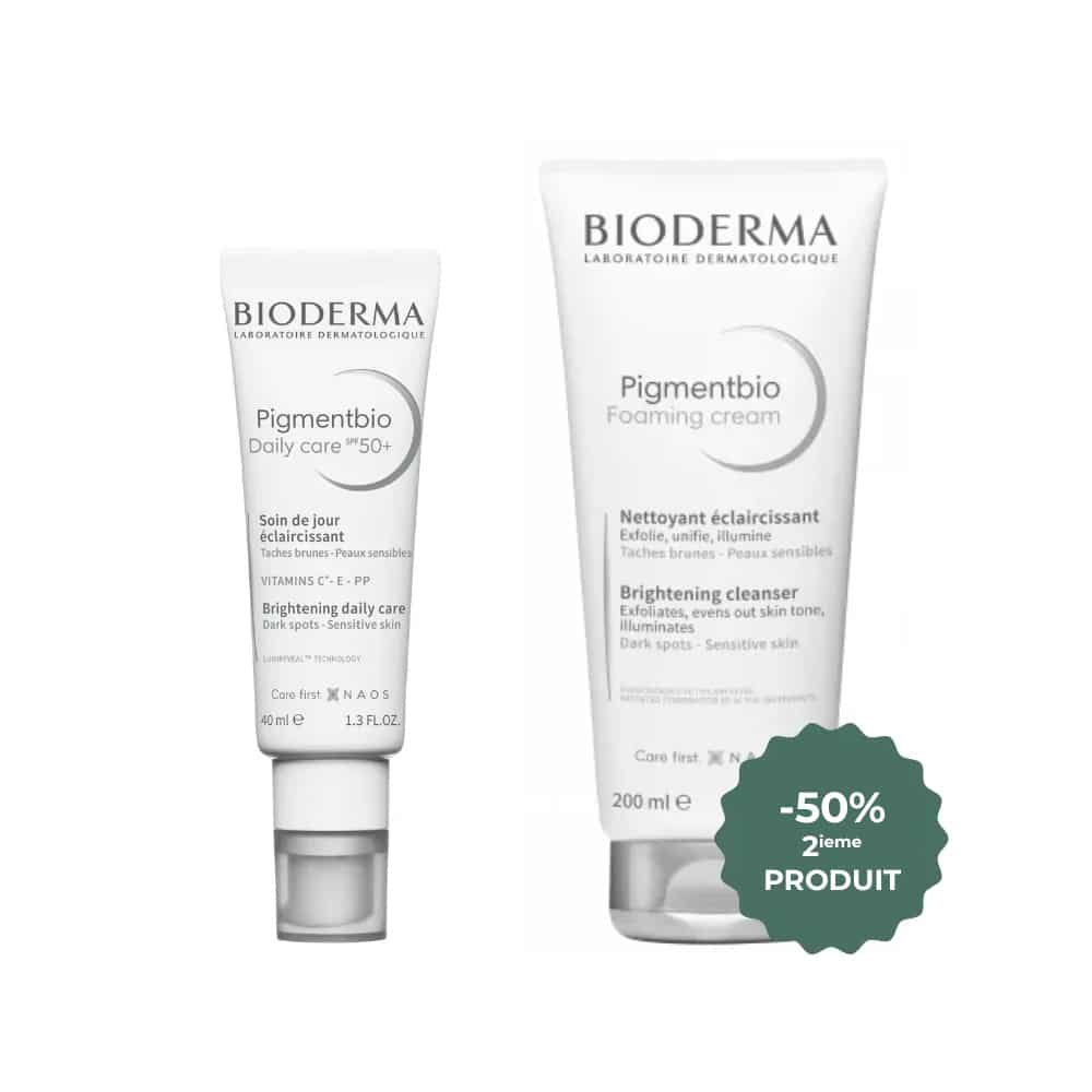 Bioderma DUO Pigmentbio Daily Care SPF50+ Soin de Jour 40ml + Pigmentbio Foaming Cream 200ml , un duo puissant spécialement conçu pour lutter contre les taches pigmentaires tout en protégeant et purifiant la peau. Cette association unique offre une solution complète pour une peau plus claire, protégée et lumineuse.