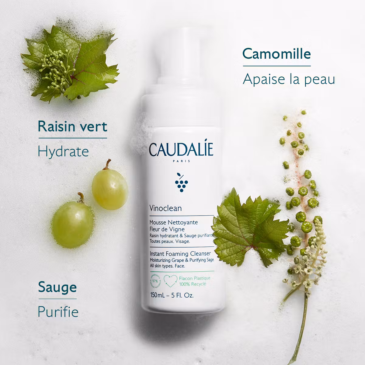Produit culte de la collection Vinoclean, la Mousse Nettoyante Fleur de Vigne est une lotion cristalline qui se transforme en une mousse généreuse et aérienne pour offrir à la peau un cocon de douceur.