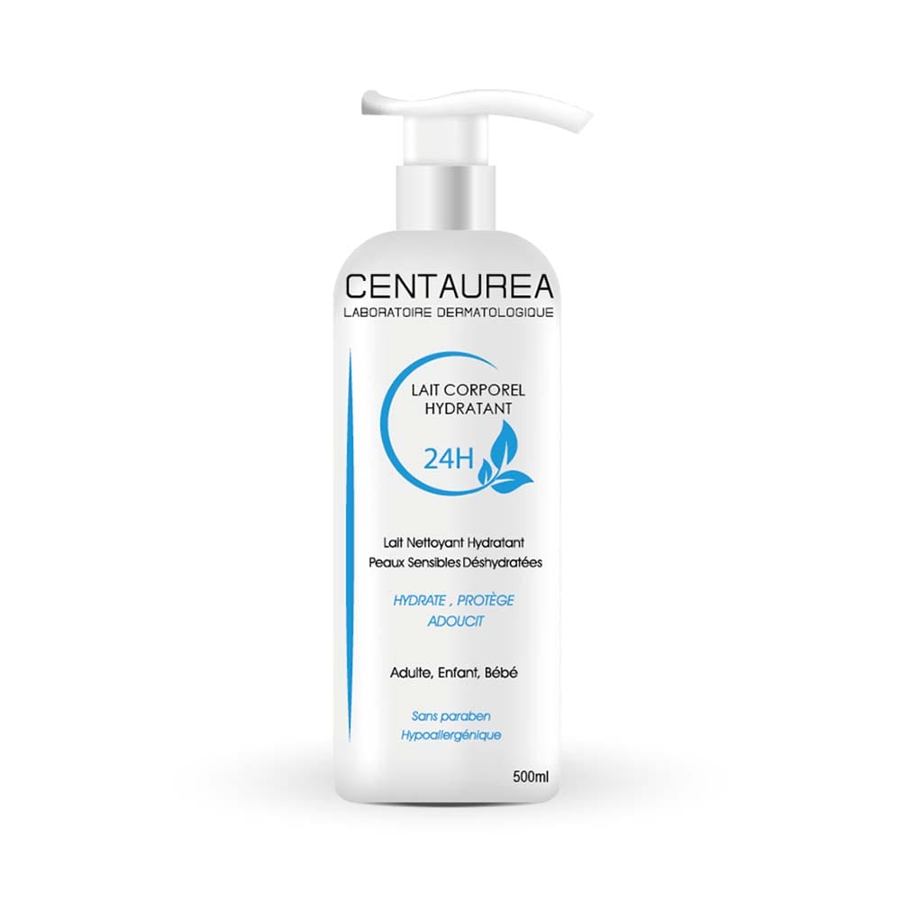 Centaurea Lait Corporel Hydratant 24H 200ml|500ml , une solution innovante pour prendre soin des peaux déshydratées grâce à sa formule enrichie en extrait de fleur de coton, complexe hydro-essentiel et agents filmogènes. Ce lait corporel unique offre une hydratation intense qui dure jusqu’à 24 heures, permettant à votre peau de retrouver élasticité, douceur et un aspect satiné dès la première application. Sa texture fluide pénètre rapidement sans laisser de sensation grasse ou collante, offrant fraîcheur et confort immédiats.