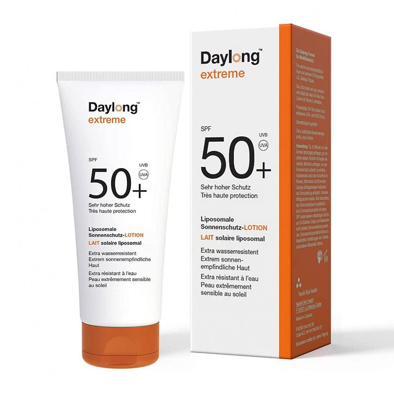 Daylong Extreme Lait Solaire Liposomal SPF50+ est une très haute protection solaire résistante à l’eau, pour les peaux extrêmement sensibles au soleil et les expositions extrêmes aux UV (montagne, tropiques, etc).