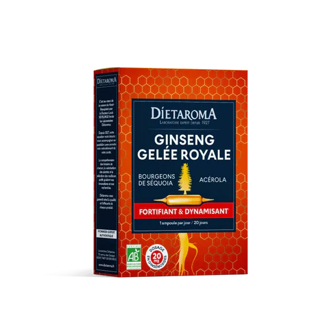Eau, jus de raisin blanc*, gelée royale*, extrait de ginseng racine* (Panax ginseng), poudre d’acérola fruit* (Malpighia glabra), macérat hydroglycériné de jeunes pousses de séquoia* (Sequoiadendron giganteum), arôme naturel d’orange*