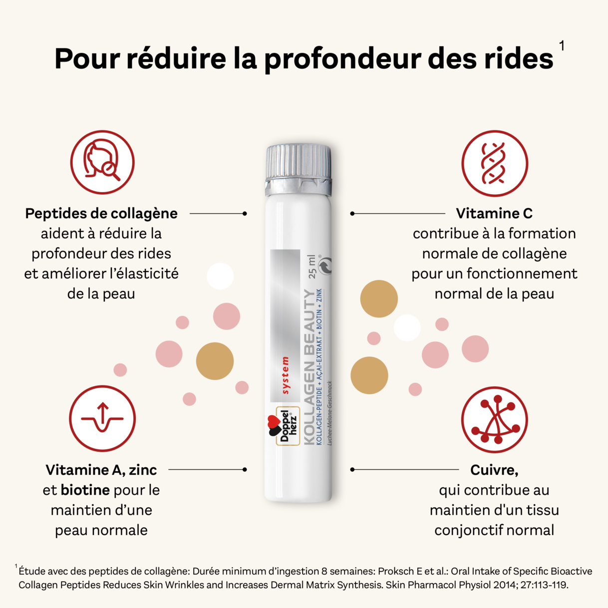 Les nutriments soigneusement sélectionnés de Doppelherz system KOLLAGEN BEAUTY sont fournis sous forme liquide au délicieux goût de lychee et melon, conditionné dans de pratiques flacons à dose unique.