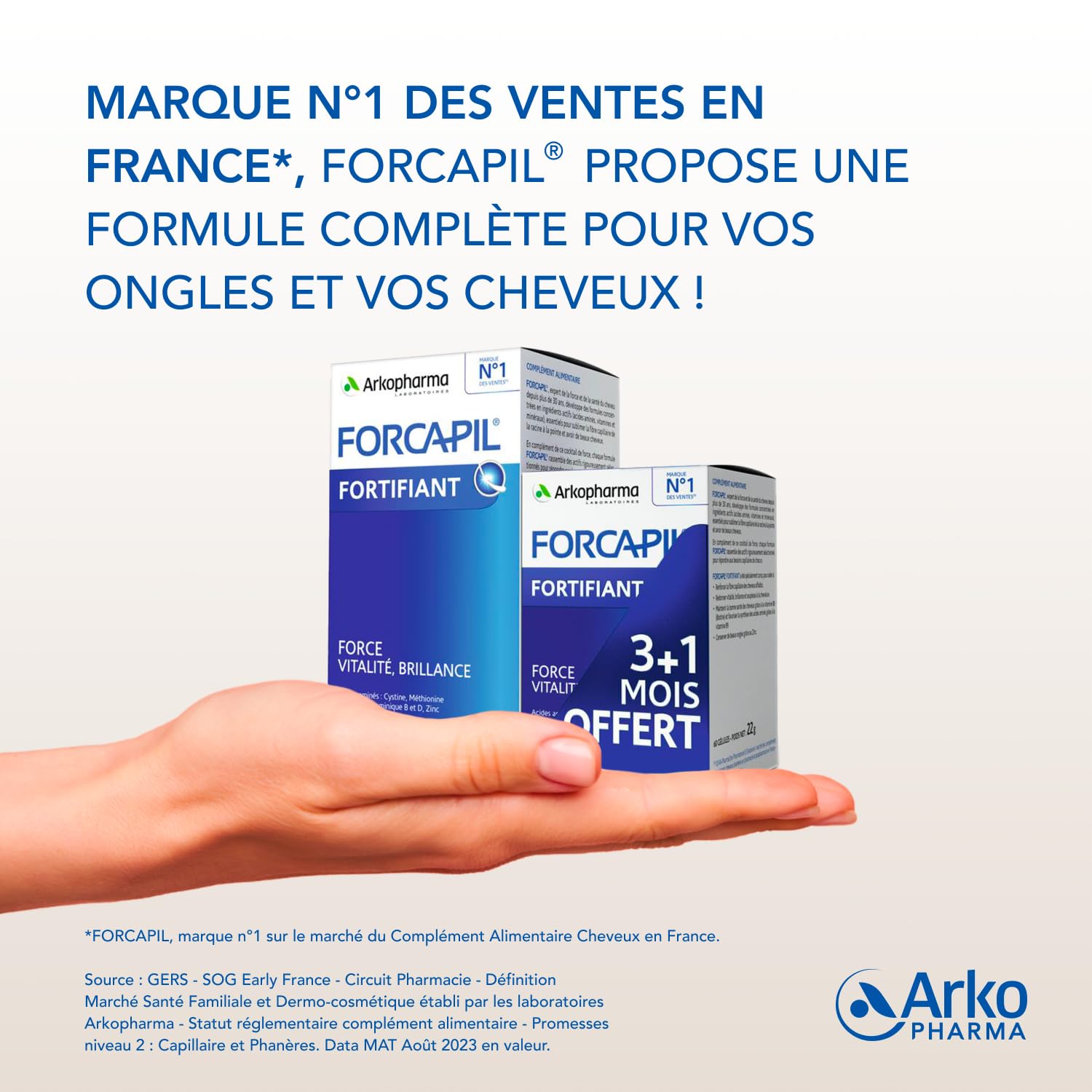 Élu comme étant « Le produit préféré des Français »*, Forcapil® contient des acides aminés soufrés (cystine et méthionine), des vitamines et des minéraux rigoureusement sélectionnés par les experts des laboratoires Arkopharma. Une formule complète pour vos ongles et vos cheveux !