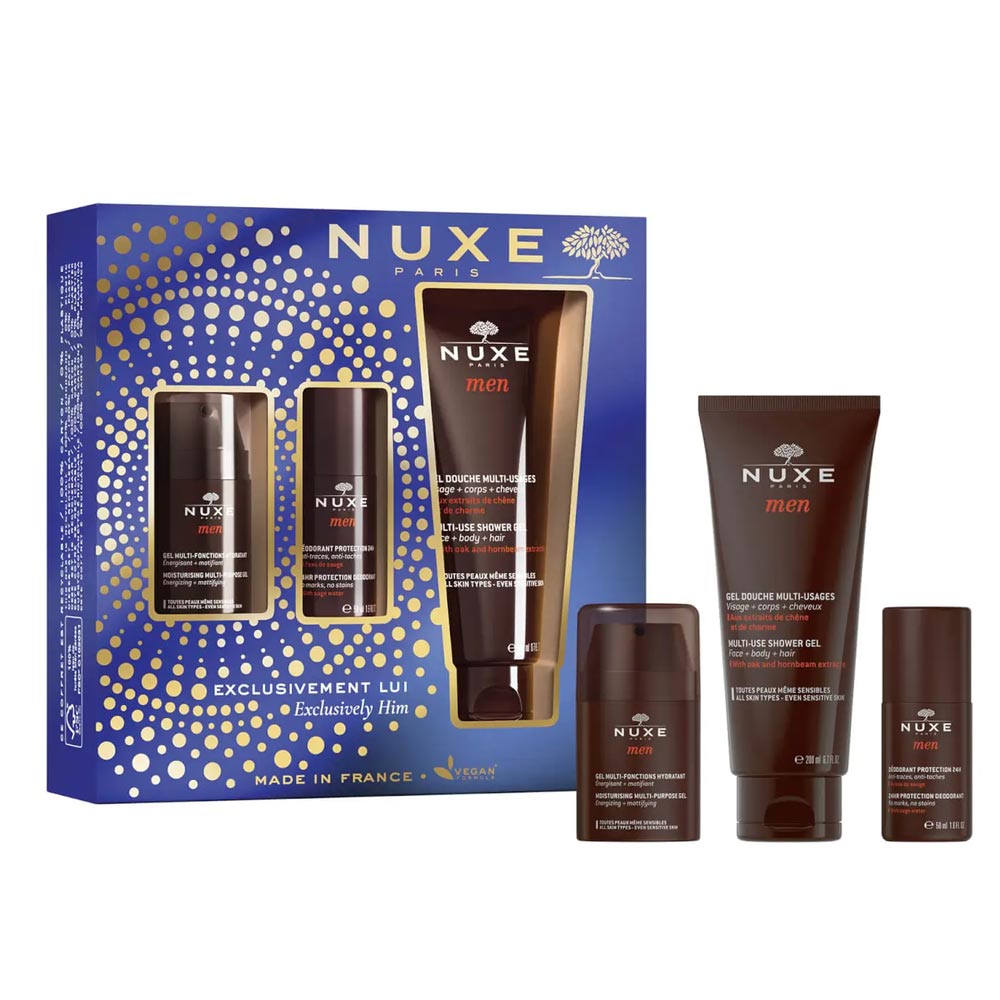 Nuxe Coffret Exclusivement Lui est un coffret de 3 produits pour découvrir l’efficacité des extraits d’actifs d’arbres en prenant soin de la peau des hommes. Il conviendra à tous les types de peaux, même sensibles :