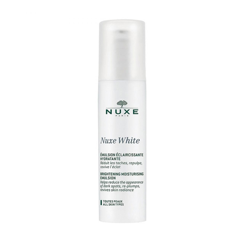 Nuxe White émulsion éclaircissante hydratante 50 mL , réduit les taches, repulpe, ravive l’éclat aux fleurs blanches et rose de porcelaine.