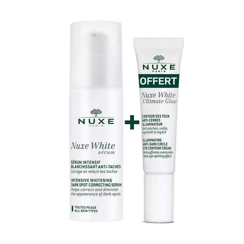 Nuxe white serum intensif blanchissant anti-taches 30ml Ce sérum léger est un véritable concentré de lumière qui intensifie l’éclat de la peau. Sa technologie éclaircissante absolue (Pivoine Blanche et Vitamine C stabilisée) corrige les taches en agissant sur l’une des principales causes de leur apparition la pollution. La taille et l’ intensité des taches sont réduites. Le teint est unifié, révélant la transparence d’une peau de bébé, vibrante de perfection et de lumière.
