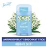 Secret déodorant laisse instantanément une sensation de fraîcheur, de propreté et de protection de longue durée jusqu’à 48 heures. Il possède un arôme délicat et sensuel de muguet. Son format de stick solide et très pratique, facile à utiliser et permet de le glisser dans votre trousse de toilette ou dans votre sac à main.