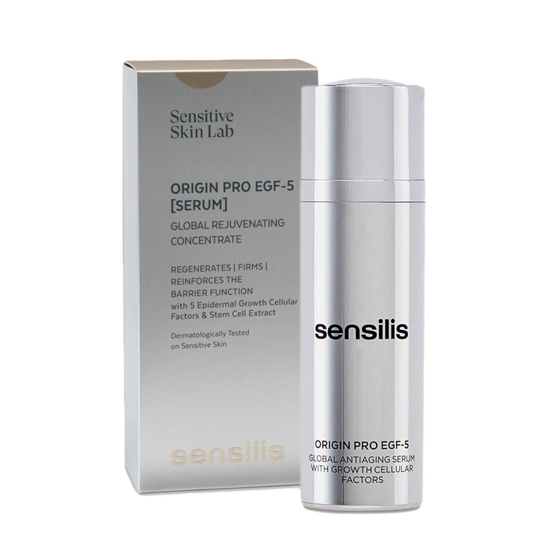 SENSILIS ORIGIN PROEGF-5 SERUM 30mL Concentré rajeunissant global : répare les signes du passage du temps, en augmentant la capacité de régénération de la peau et en la raffermissant en profondeur. Grâce à sa formule exclusive à base de 5 facteurs de croissance et un complexe pro-aging qui protège les cellules souches épidermiques.